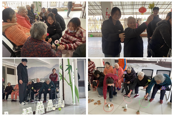活动伊始,同学们为老人们献上了提前用扭扭棒制作的数十束色彩鲜艳的“永生花”,并送上暖心的祝福话语,现场暖意融融。随后,大家蹲坐在老人身边暖心陪伴,陪他们聊天谈心,了解他们当前的生活状况,耐心倾听他们讲述往事中的温情点滴,笑声与回忆交织成温暖的画面,整个院内洋溢着温馨、祥和的气氛。在趣味活动环节,青年学子们为老人们精心设计“欢乐套圈”和简易版“保龄球”游戏,老人们在游戏中活力焕发,现场充满着欢声笑语。活动尾声,同学们与老人们共同唱响《歌唱祖国》等经典红色歌曲,铿锵的旋律中,青年学子与银发老人的歌声交汇成跨越代际的信仰共鸣。