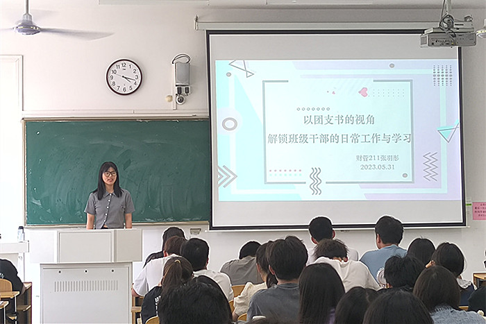 校先进团支部代表、国贸211团支书何敏以“团支书的自我修养”为题分享了团支部建设的经验,他表示在开展工作时既要围绕同学发展,倾听同学的声音;又要坚守初衷与底线。在活动策划与开展中,要积极与同学沟通,吸纳好的意见,激发支部成员的参与热情。校优秀学生干部代表、院学生会执行主席袁哲分享了自己的学生干部成长经历,希望同学们明确学生干部定位,不忘初心,用高度的责任感和使命感做好每一件小事,以高标准严要求规范自己,兼顾学习与工作。校优秀共青团员代表、金融工程203班班长余玲玲及财务管理211班团支书张羽彤分别结合自身工作角色,从自身建设、团支部建设、班级凝聚力提升等方面详细介绍了自己在开展班级工作时的经验做法,让与会同学深受启发。