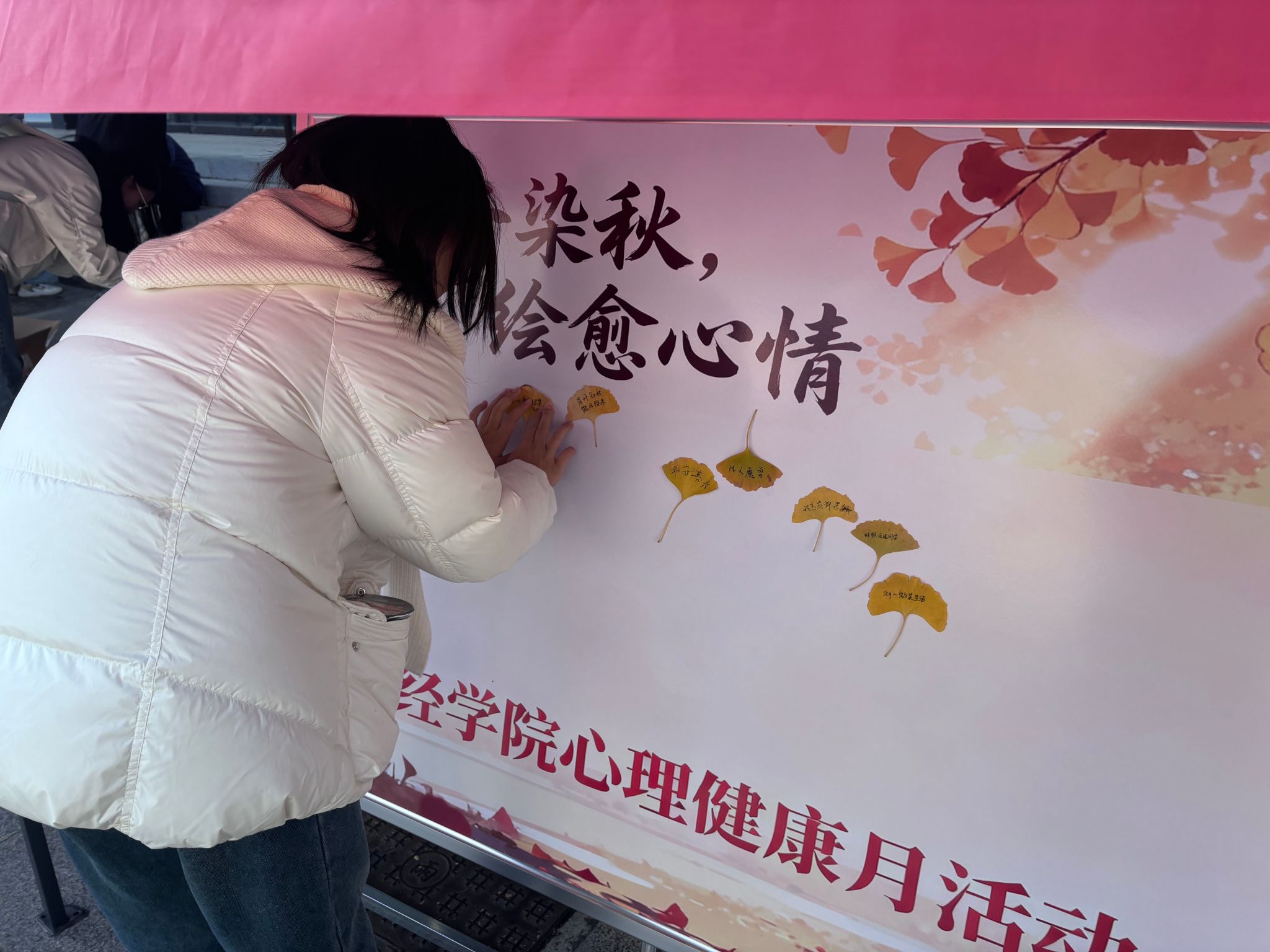 活动现场,“颜色文字大挑战”成了人气焦点。参与者需快速辨识文字颜色而非文字本身——“红”字印成绿色、“蓝”字写为黄色的设计,让大家在手忙脚乱的应答中欢笑不断,既打破了思维定式,又在趣味 “大脑急转弯” 中有效舒缓了日常学习生活紧张。另一侧的“银杏心语板”前,同学们自己收集银杏叶,写下烦恼或期许贴在展板上,让“被看见,被接纳“的温柔在校园中传递。层层叠叠的叶片,既妥帖安放了大家的心事,也帮助同学们在分享与倾诉中梳理情绪、轻装前行。成功参与打卡两项互动游戏的同学,还能收获温暖热水袋、暖心便签本等小礼品,把快乐与治愈一起“打包”带走。