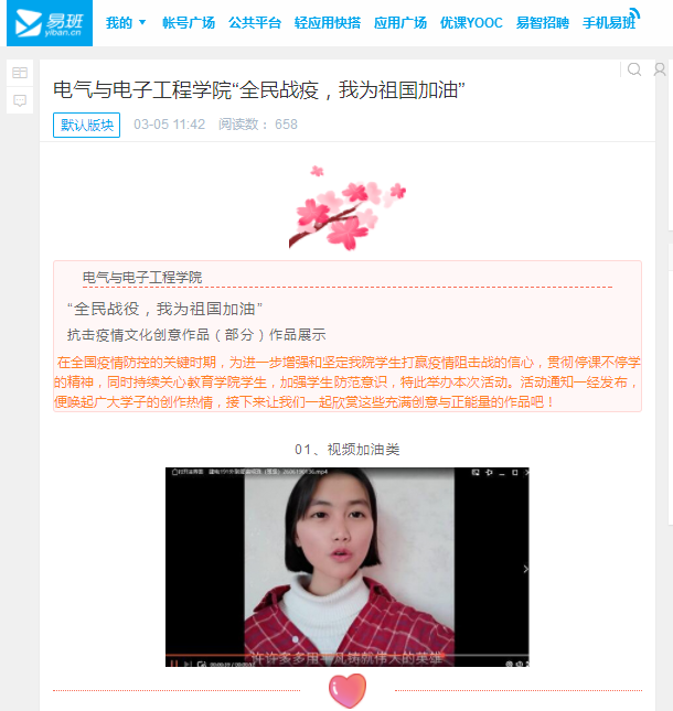 活动中征集到学生们创作的文学类、视频加油类和绘画类作品。作品有的展现了青年志愿者积极参与疫情防控工作,有的展现了战胜疫情的坚定信心,有的抒发了爱国主义情怀。学生们用各形式祝福武汉,为祖国加油。学院易班工作站专门开设微社区专栏展示这些作品,并通过易班轻应用积极发动学院学生为这些作品投票。