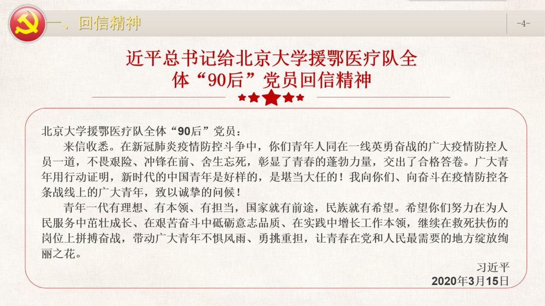为深入学习贯彻习近平总书记给北京大学援鄂医疗队全体“90后”党员回信精神,凝聚众志成城抗击疫情的强大青春力量,4月10日,电气与电子工程学院以团支部为单位,围绕活动主题,通过“学习强国”视频会议、微信视频、腾讯视频会议等方式于线上召开四月主题团日活动——学回信精神,担复兴大任,学院全体共青团员及全体青年参加。