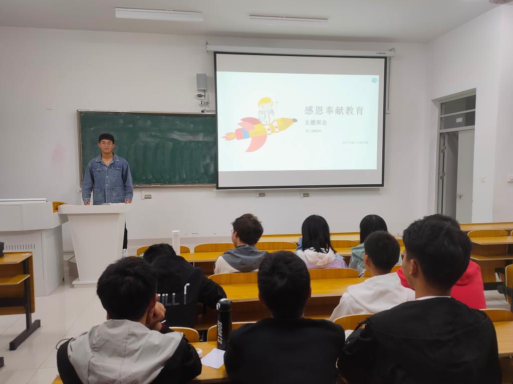 感恩是一种生活态度、一种美德,为培养学生的感恩意识和奉献精神,10月28至30日,电气与电子工程学院组织2020级新生陆续开展“感恩·奉献”教育主题班会活动,活动由各班班长主持。