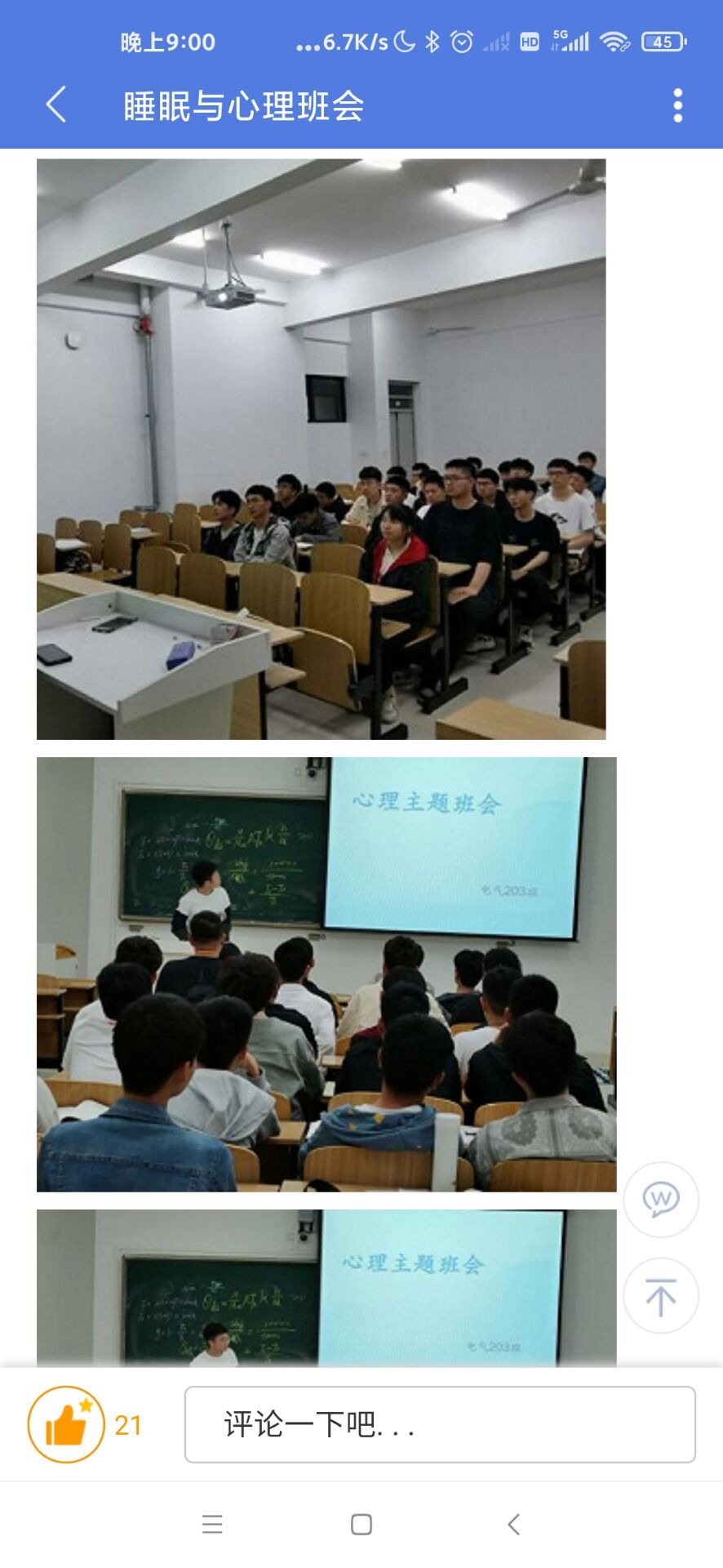为进一步推进学院学生心理健康教育工作,引起同学们对睡眠重要性的认识,养成早睡早起的良好习惯,不断提高同学们的心理健康水平,5月7日至20日,学院组织各班级积极开展“睡眠与心理健康”主题班会,会议由各班心理委员主持。
