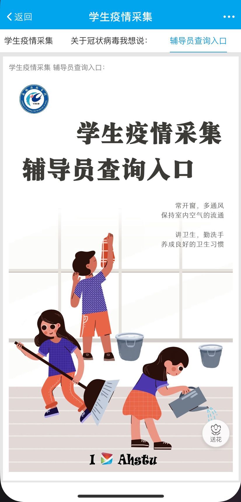 建队伍,确保专人负责。为确保防控疫情采集及时有效,由学生处统一部署,学生科具体负责,经各学院推荐设1名学生疫情防控工作联络员,各学院专兼职辅导员担负起所带班级的信息发布工作,建立起了“校—院—班”三级信息发布队伍,及时发布了上级文件要求、学校工作安排、疫情进展情况、个人预防注意事项、疫情防控知识,每天对全体学生信息发布与采集实现全覆盖。