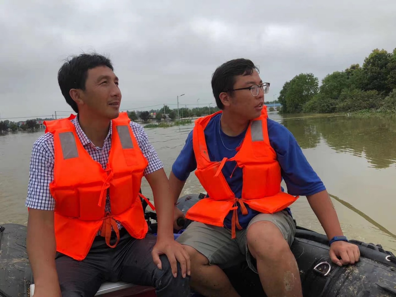 志愿者们达到现场后,顾不上休息,立刻投入到鹅厂重建工作中。他们帮助清退洪水,转移鹅苗孵化设备、清理屠宰车间废墟,洗刷清扫鹅舍卫生,寻找并清点剩余鹅苗数量,配备鹅苗饲料,做好鹅厂灾后卫生防疫工作。特别是2019级畜牧领域研究生徐茂森,洪水之前就一直在基地参观学习,帮助鹅厂养殖鹅苗。发生灾情之后他更是不顾危险,奋战在抗灾一线。镇上断水断电断网,条件非常艰苦。徐茂森不仅帮助消防员把镇上老人和小孩转移到安全地方,协助政府人员发放救灾物资,同时在人员安排妥善后,又随基地工作人员一起划船几公里寻找被大水冲走的皖西白鹅,以及被大水冲走的场内物品。