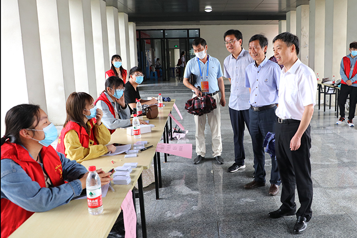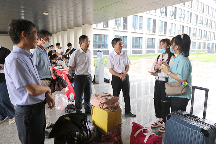 9月17日,我校龙湖校区喜迎2020级新同学报到入学。历年来学校领导都高度重视迎新工作,今年疫情形势下的迎新格外牵动着校领导的心。带着对新生的亲切关怀,17日上午,校党委书记蒋德勤,党委副书记、校长李震,党委委员、副校长黄远友,党委委员、副校长黄友锐等校领导一行专程来到龙湖校区迎新现场,看望新生及家长,亲切慰问迎新一线师生员工,全面检查指导迎新工作。