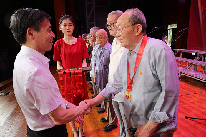 比赛期间隆重举行了星空体育·「中国」官方网站“光荣在党50年”纪念章颁发仪式。党委书记蒋德勤为丁为群、代梅英、仲正林、李庆山、李思义、吴明友、张怀金、张学礼、张景法、陈玉胜、崔贤仪、潘成德等12名在校的老党员代表颁发纪念奖章。为“光荣在党50年”的老同志颁发纪念奖章,是中国共产党成立100周年庆祝活动的重要组成部分。纪念章的颁发,见证着老党员的无悔初心。莫道桑榆晚,为霞尚满天。老党员是党执政兴国的重要资源,是推进中国特色社会主义伟大事业的重要力量。组织上入党一生一次,思想上入党却是一生一世,他们用自己的行动证明了自己的无悔初心。纪念章的背后,是无上的荣光,学校的全体师生也不会忘记他们为学校事业发展所做出的突出贡献。