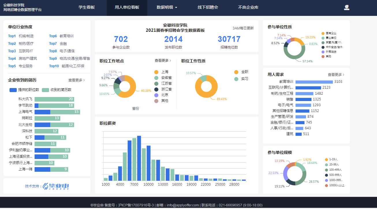 根据2018-2020三个年度毕业生就业质量报告,我校毕业生省外就业主要面向长三角核心地区,其中,在沪就业比例一直在10%以上。毕业生去向就是就业工作取向,学校加强长三角区域就业布局,作为毕业生就业工作的重点布局领域。2020年下半年疫情缓解以来,学校积极与上海学生事务中心联络,继续拓展合作领域,截至2021届毕业生离校时,先后举办“多方联动、聚力就业”上海市2021届高校毕业生春季“安科之生”专场招聘会、“安科之生”春季就业冲刺月(互联网专场)、高校毕业生就业促进周2021年“安科之生”专场、毕业季“安科之生”专场、长三角招聘会星空体育·「中国」官方网站“海聚英才”2021年离校未就业毕业生专场云聘会、长三角“安科之生”2021届毕业生离校未就业专场,6个场次共有36345次访问记录,投递简历2033份,702家用人单位共发布5007个职位,73865个岗位,涉及机械制造、制药医疗、互联网等诸多行业领域,涵盖了数字经济、电子信息、新材料等重点发展产业,为毕业生融入长三角区域就业提供了广阔的双选平台。(特约通讯员:司萍 审核:施培智 编辑:张威)