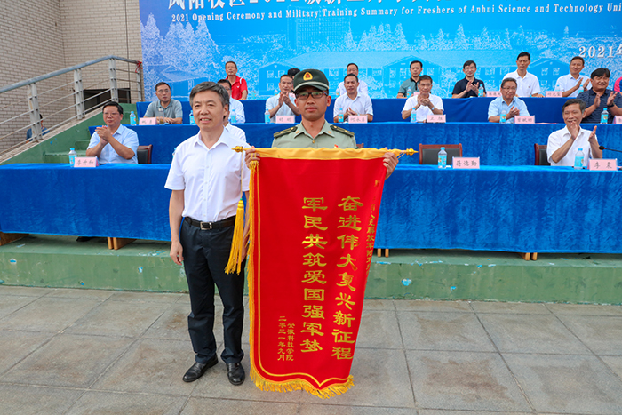 典礼上,蒋德勤宣布军训汇报表演开始,并代表学校向陆军装甲兵学院蚌埠校区赠送锦旗。