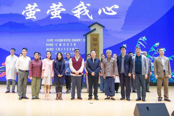 马鞍山艺术剧院在龙湖校区展演的剧目从节目内容、舞台呈现、演员表现和风格特色等方面,都独具特色。戏曲《萤萤我心》以马鞍山市和县退休教师叶连平为原型,根据其先进事迹创作改编,剧中塑造的“叶清平”在共产党员张红华的引领下,在乌江渡村村民们的帮助下,树立了自己新的人生目标“做一个对人民有用的人”,他大爱无疆,勤勤恳恳,献力于乡村教育事业,让涓涓细流汇集成河。艺术家们用精湛的演技、字正腔圆的唱功和韵味十足的表演,在一颦一笑、举手投足间将整场演出推向高潮,带领现场观众走进和风细雨的几十年不平凡的岁月。