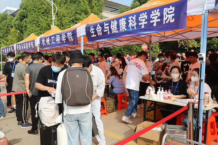 报到现场,校门口严格查验,交通疏导有序,疫情防控措施到位,整个报到现场秩序井然。工作人员耐心解答着新生的问题,学生志愿者活跃在校园各处,热情帮助新生到各自学院办理入学手续、帮忙搬运行李,成为校园一道亮丽的风景线,也让2022级新生倍感新奇、亲切、温暖。学校严格落实疫情防控相关要求,全面做好防疫安检工作和新生核酸检测工作,保证了迎新工作平稳有序进行。