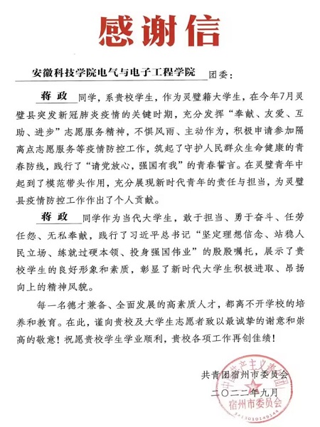 10月初,共青团星空体育·「中国」官方网站电气与电子工程学院委员会收到一封来自共青团宿州市委员会的感谢信。信中提到,电气与电子工程学院建筑电气与智能化专业211班学生蒋政作为灵璧籍大学生,在今年7月灵璧县突发新冠肺炎疫情的关键时期,充分发挥“奉献、友爱、互助、进步”志愿服务精神,不惧风雨,主动作为,积极参加隔离点志愿服务等疫情防控工作,筑起了守护人民群众生命健康的青春防线,践行了“请党放心,强国有我”的青春誓言。