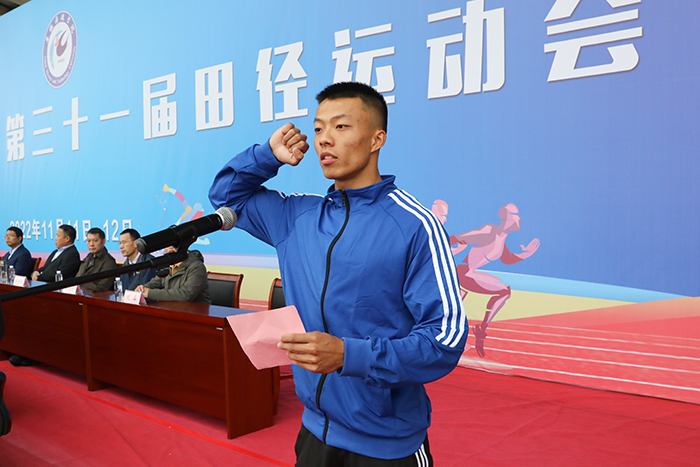 开幕式上,体育教学部教师钱德代表全体裁判员宣誓,表明了公正裁判的态度;动物科学学院学生曹震代表运动员宣誓,表达了奋勇争先的决心。