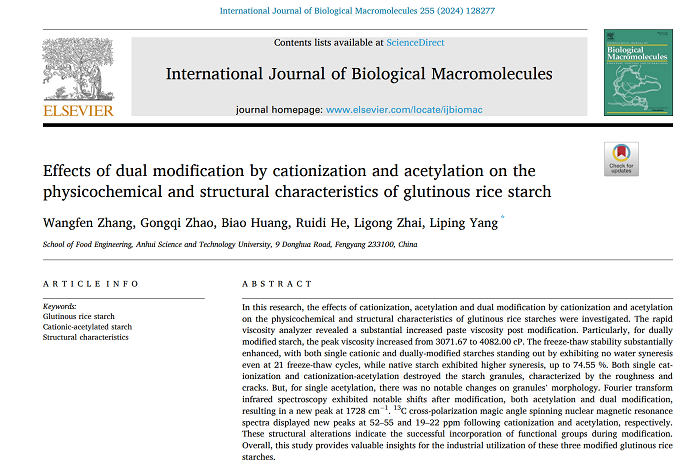 近日,我校2021级食品加工与安全领域研究生张王芬在生化与分子生物学领域Top一区期刊International Journal of Biological Macromolecules(IF=8.2)在线发表题为“Effects of Dual Modification by Cationization and Acetylation on the Physicochemical and Structural Characteristics of Glutinous Rice Starch”的研究论文。食品工程学院粮油及其副产物精深加工团队与营养科技创新团队负责人杨丽萍副教授为通讯作者,星空体育·「中国」官方网站为唯一完成单位。