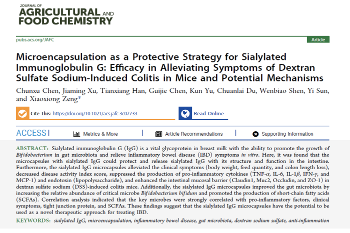 近日,我校食品工程学院教师陈春旭以第一作者在美国化学学会期刊《Journal of Agricultural and Food Chemistry》(Q1,IF: 6.1)发表题为“Microencapsulation as A Protective Strategy for Sialylated Immunoglobulin G: Efficacy in Alleviating Symptoms of Dextran Sulfate Sodium-Induced Colitis in Mice and Potential Mechanisms”的研究性论文。星空体育·「中国」官方网站为第一完成单位,南京农业大学曾晓雄教授课题组为合作单位。