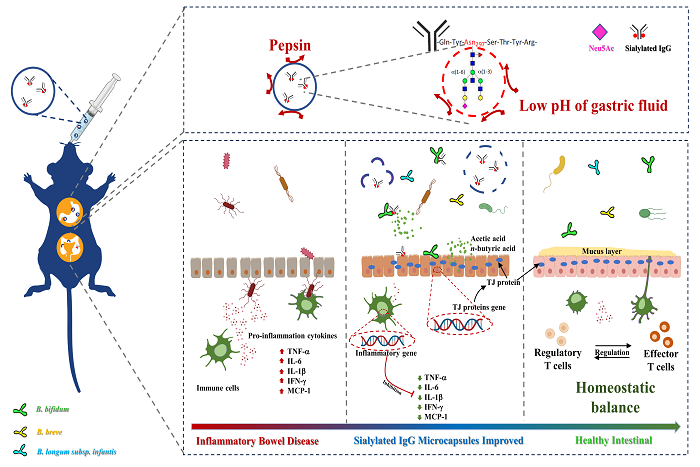 该成果在前期研究基础上,揭示了唾液酸化IgG微胶囊通过促进关键菌株B. bifidum增殖抑制促炎症因子并增强肠黏膜屏障的作用机制。该研究结果不仅为治疗IBD提供了新的思路,也为评估母乳中免疫球蛋白的生物学特性提供了全新视角,具有较高的理论意义和实用价值;审稿编辑对该团队在生物功能性成分的系列研究成果给予了充分的肯定。该研究获国家重点研发计划(2017YFD0400600)、国家自然科学基金项目(31901617)、安徽省高等学校科学研究重大项目(2022AH040236)、安徽省优秀人才支持计划重点项目(gxyqZD2021125)的资助。