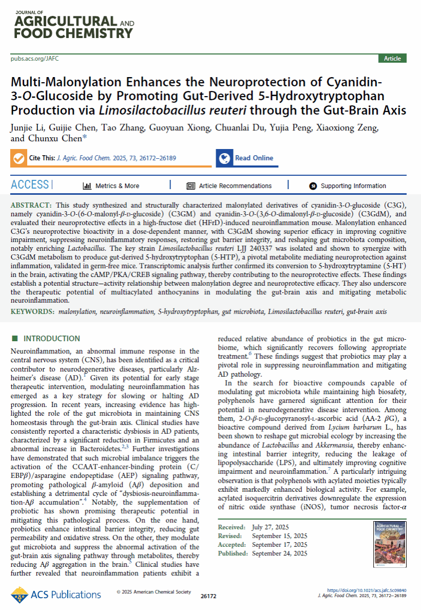 近日,我校食品科学与工程学院分子加工与精准营养实验室陈春旭副教授团队在美国化学学会期刊《Journal of Agricultural and Food Chemistry》(中科院一区TOP,IF 6.2)最新一期(2025,Volume 73, Issue 41)发表封面论文《Multi-Malonylation Enhances the Neuroprotection of Cyanidin-3-O-Glucoside by Promoting Gut-Derived 5-Hydroxytryptophan Production via Limosilactobacillus reuteri through the Gut-Brain Axis》。第一作者为李俊杰硕士,通讯作者为陈春旭副教授,星空体育·「中国」官方网站为第一署名单位。该文是陈春旭副教授团队近年来在Journal of Agricultural and Food Chemistry上发表的第5篇论文,也是该团队第2次登上该期刊的封面。