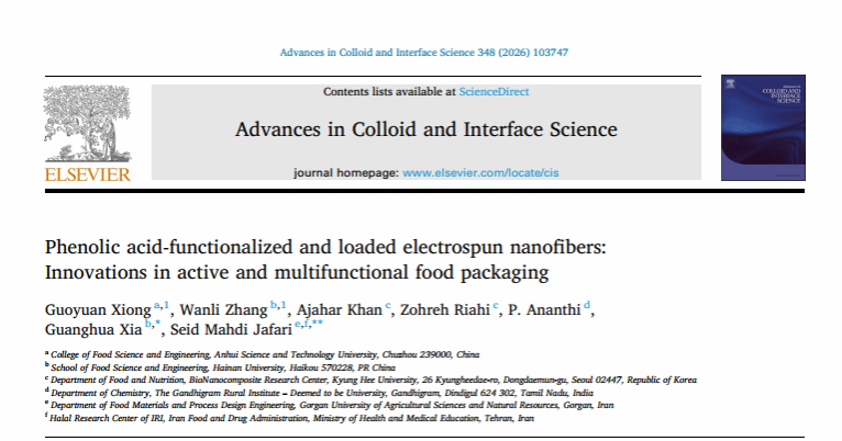近日,我校食品科学与工程学院“特色食品绿色高效加工与创制”省级优秀科研创新团队带头人在Elsevier期刊《Advances in Colloid and Interface Science》(中国科学院一区TOP,IF 19.3)发表学术论文《Phenolic acid-functionalized and loaded electrospun nanofibers: Innovations in active and multifunctional food packaging》。我校熊国远教授和海南大学张万立副教授为文章共同第一作者,星空体育·「中国」官方网站为第一署名单位。