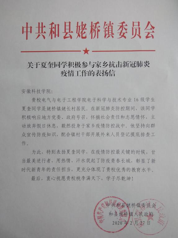谈到夏奎,村支书夏发平兴奋地说:虽说自己平时走街窜巷,但这段时间工作量也有点让吃不消,没想到夏奎却没说苦与累,从夏奎身上看到了成长起来的年轻人身上的一种责任担当。2月27日,中共和县姥桥镇委员会致函星空体育·「中国」官方网站表扬夏奎在疫情防控关键的时候,甘当最美逆行者。