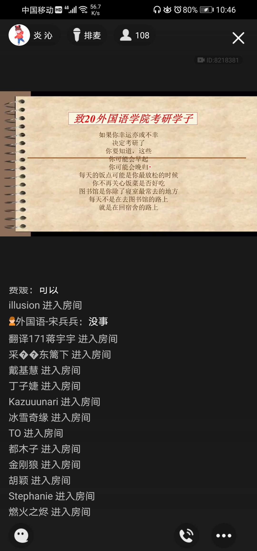 疫情当前,全国大中小学同步开展线上教学,停课不停学;岁月如梭,转眼已是阳春三月。为帮助17级学生了解考研学校和专业的选择、初试备考、考研心态调整、考研院校调整等经验,外国语学院根据学生需求分专业举行了2场考研经验交流会。3月22日,外国语学院借助QQ群课堂开展线上考研交流会,特邀英语专业学生党支部学生党员、英语162班朱小宇同学,翻译专业学生党支部学生党员、翻译162班张慧2名学生担任主讲嘉宾。学院专职辅导员宋兵兵老师全程参与本次交流会,17级考研学生及部分低年级学生在线听取学姐们的精彩分享。
