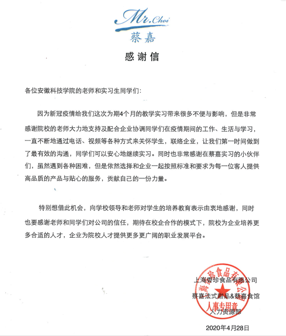 2019年12月16日-2020年4月30日为期四个半月的2017级烹饪与营养教育专业的校外专业实习即将结束了。春节前夕,一场突如其来的新冠肺炎疫情加速蔓延,牵动着全国人民的心,也给正在校外实习的学生带来了严重的影响。如今,实习临近尾声,食品工程学院杜传来副院长专程就实习结束后学生返家及学生实习结束后相关问题走访实习单位,并看望问候了因疫情滞留实习单位的这部分学生。