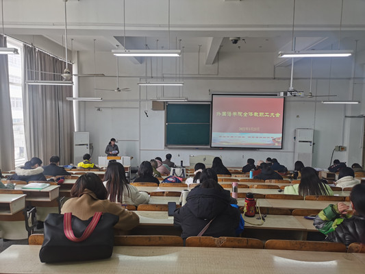 3月23日下午,外国语学院在求知楼A202教室举行全体教职工大会,部署新冠肺炎疫情防控工作、推进学院年度重点工作。学院领导班子及全体教职工参加会议,会议采用线下和线上同步模式,因居家隔离等原因无法到场的教职工在线上参加会议。会议由学院院长陈德用主持。