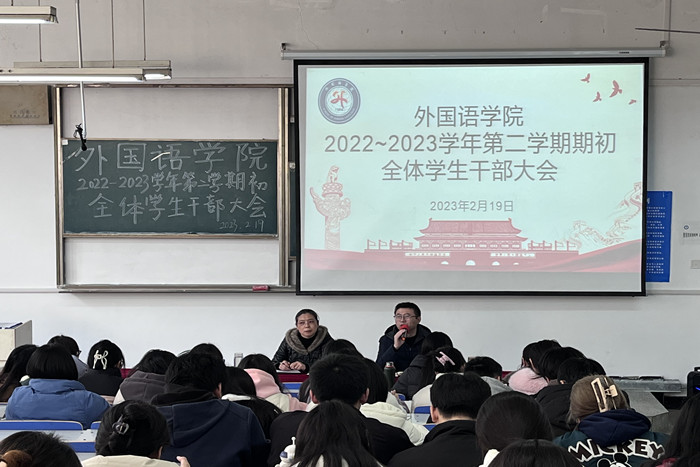 2月19日下午,外国语学院在求知楼A106教室召开学院2023年春季学期期初全体学生干部大会。学院党委书记蔡为青、党委副书记张海亮、副院长洪民以及全体辅导员出席会议,学院团委、学生会、艺体中心、易班工作站负责人以及各班级主要学生干部参加会议,会议由张海亮主持。