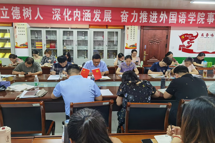 外国语学院党委书记蔡为青首先带领全体教职工集中学习习近平总书记在中央政治局第五次集中学习时的讲话,要求全体教师提高政治站位,加强思想政治学习;然后她再次强调了师德师风建设的重要性,要求每位老师务必完成师德学习教育,各教研室必须集中学习、研讨,同时她还部署了师德专项整治工作;最后要求各基层党组织暑期继续深入开展主题教育,以主题教育成果促进学院发展。