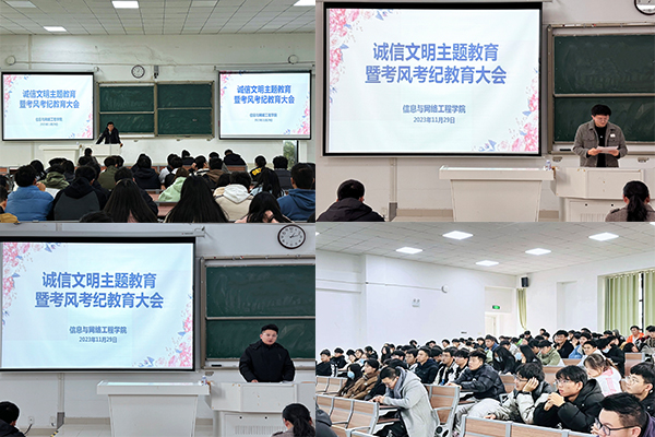 为进一步加强学院学风建设,营造良好的考试氛围。11月29日,信息与网络工程学院在致知楼C111教室召开诚信文明主题教育暨考风考纪教育会议。信息与网络工程学院党政领导和有关教师出席会议。2023级各班班委及学生会全体成员参加会议,会议由专职辅导员陈凯主持。