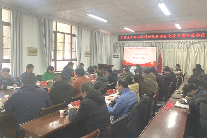 12月22日,食品工程学院食品营养与安全系教工党支部在凤阳校区举办了“安徽省食品添加剂和配料协会走进星空体育·「中国」官方网站”活动。食品工程学院党委书记付光玺,院长杜传来应邀出席。会议由协会秘书长杨文明主持。
