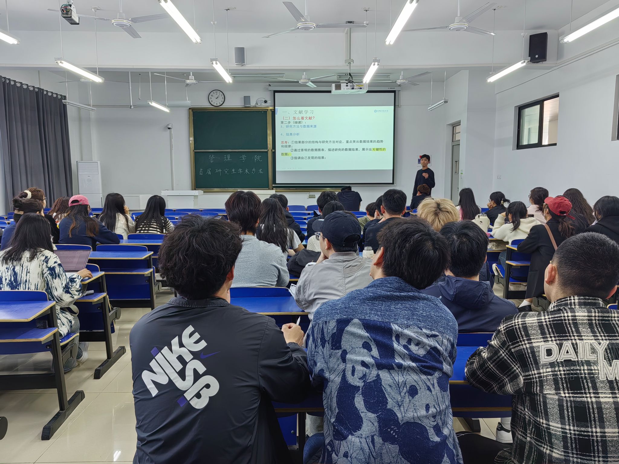 魏有文主要从论文写作的前期准备、写作技巧和心得体会三个方面展开分享。他认为论文写作前的充分准备是确保论文质量的关键,在确定研究方向与选题时,应结合自身的研究兴趣、导师团队的研究领域及研究价值与意义定写作方向。他将不同文献类型作为切入点,从综述、研究、方法等角度告诉同学们如何把握不同的文献类型的相关研究领域最新发展趋势。在谈到论文写作技巧与方法时,魏有文认为制定合理的写作计划、构建文章写作框架都是非常重要的。会后,研究生们围绕论文写作、期刊投稿等话题进行了深入交流。