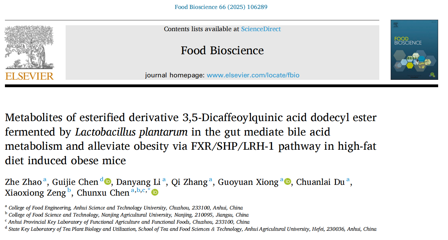 近日,食品科学与工程学院陈春旭副教授以通讯作者身份在国际Top期刊《Food Bioscience》(Q1,影响因子4.8)在线发表题为“Metabolites of esterified derivative 3,5-Dicaffeoylquinic acid dodecyl ester fermented byLactobacillus plantarumin the gut mediate bile acid metabolism and alleviate obesity via FXR/SHP/LRH-1 pathway in high-fat diet induced obese mice”的研究性论文。星空体育·「中国」官方网站2022级食品加工与安全专业硕士研究生赵哲为论文的第一作者,星空体育·「中国」官方网站为论文第一完成单位,南京农业大学曾晓雄教授课题组为合作单位。
