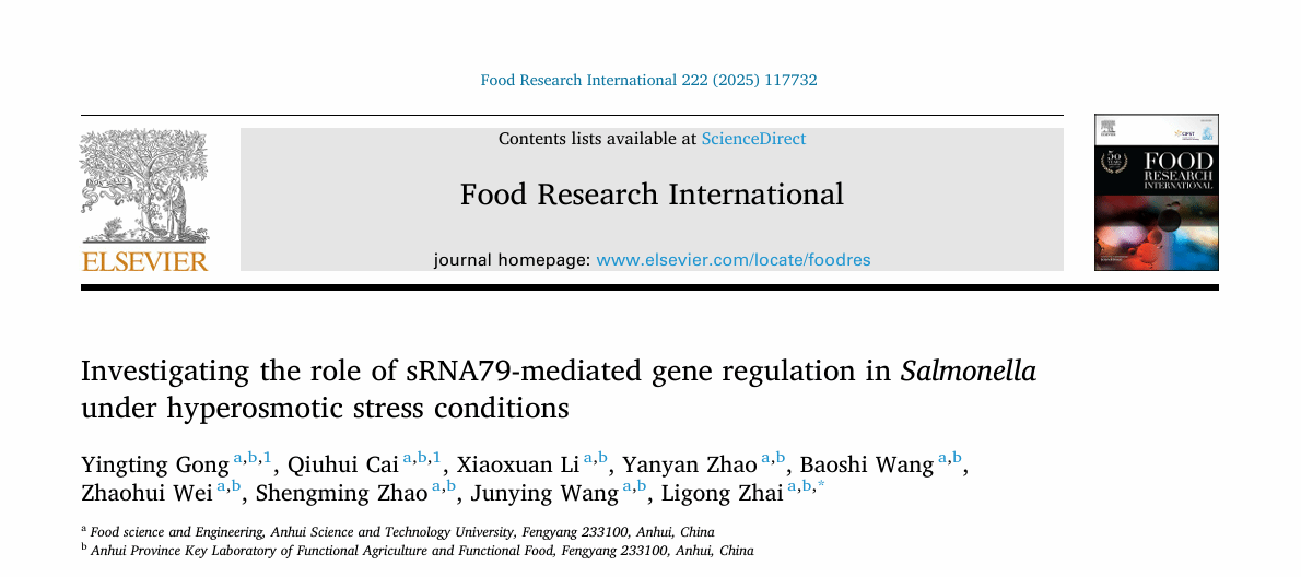 近日,我校食品科学与工程学院食品质量与安全团队在农林学科领域顶级期刊《Food Research International》(中国科学院1区top期刊,影响因子8.0)发表最新研究成果。论文题为“Investigating the role of sRNA79-mediated gene regulation in Salmonella under hyperosmotic stress conditions”,由我校2023级食品加工与安全领域研究生龚莹婷为论文第一作者,翟立公副教授为通讯作者,星空体育·「中国」官方网站为第一完成单位。