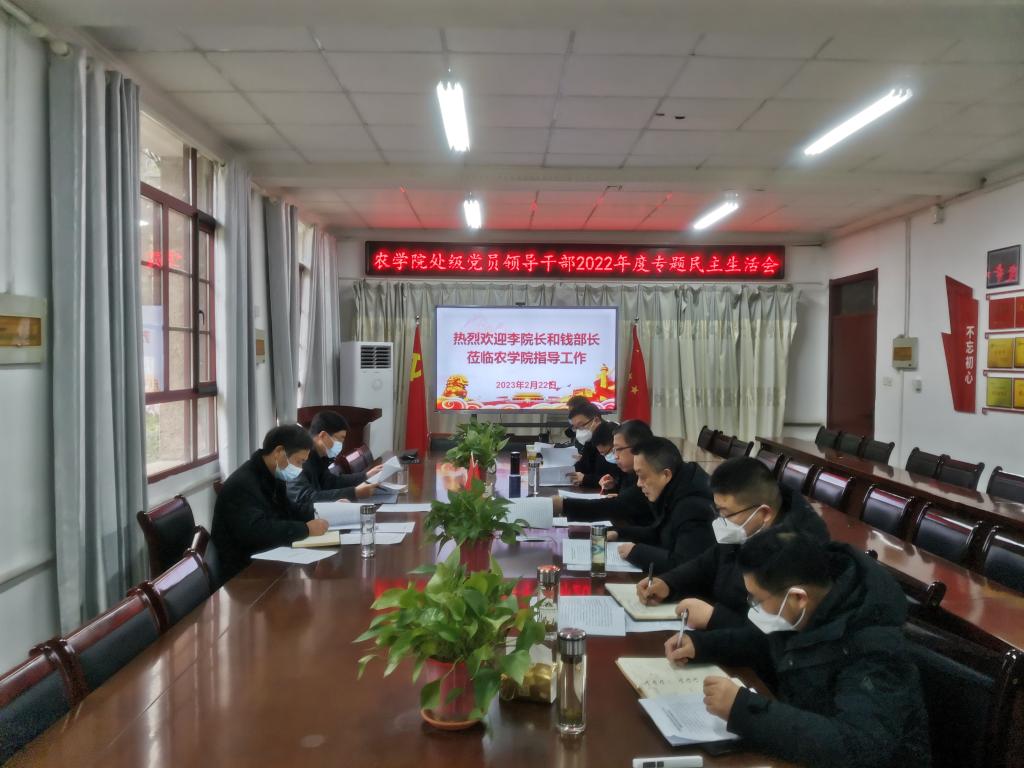 2月22日上午,农学院在学院会议室召开处级党员领导干部2022年度专题民主生活会。校党委副书记、院长李震到会指导,校党委委员、党委组织部部长、督导组组长钱锐出席会议,学院处级党员领导干部、党委委员、工会主席、党员群众和青年教师代表等参加会议。会议由学院党委记何世潮主持。