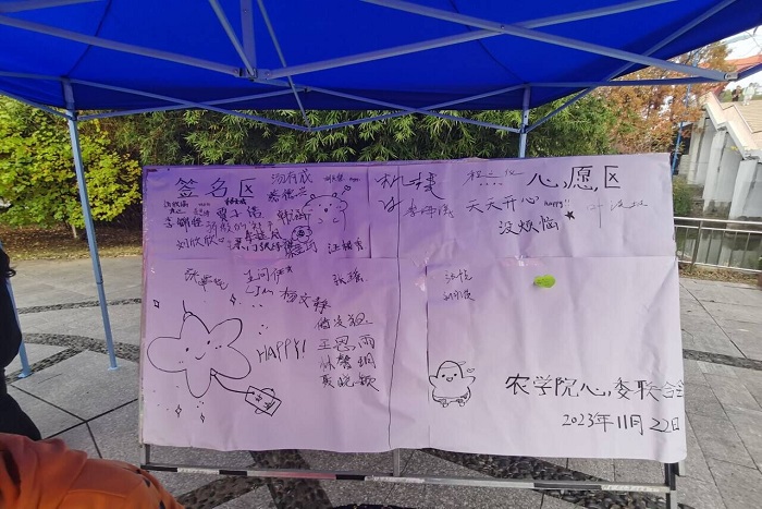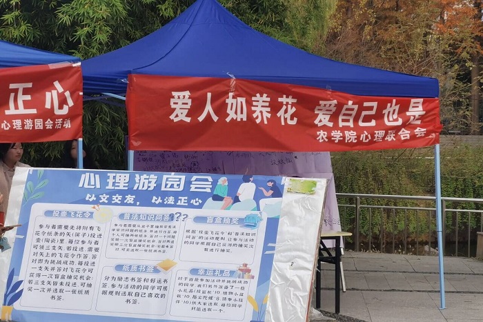 11月22日,为了进一步普及心理健康知识,农学院积极响应学校开展的“12•15大学生心理健康月活动”的精神,在西区广场举办了以“爱人如养花,爱自己也是”为主题的心理健康活动。