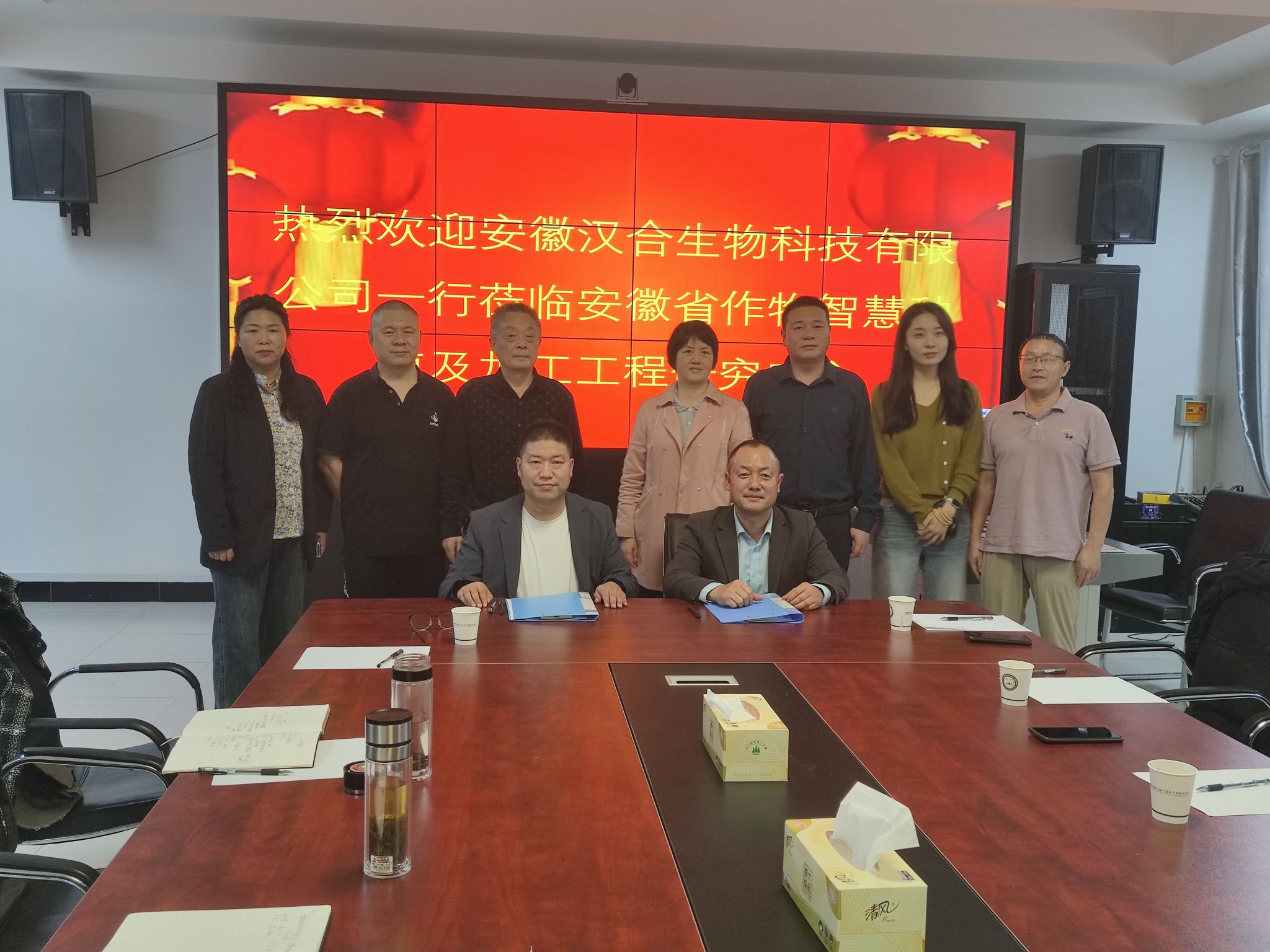 安徽汉合生物科技有限公司一行首先参观了安徽省科技成果转化中试基地智慧菌株筛选实验室仪器设备、水肥一体化中试大棚、实验基地等。随后在农学院大数据中心举行了成果转化签约仪式,并对有关技术细节进行了交流。