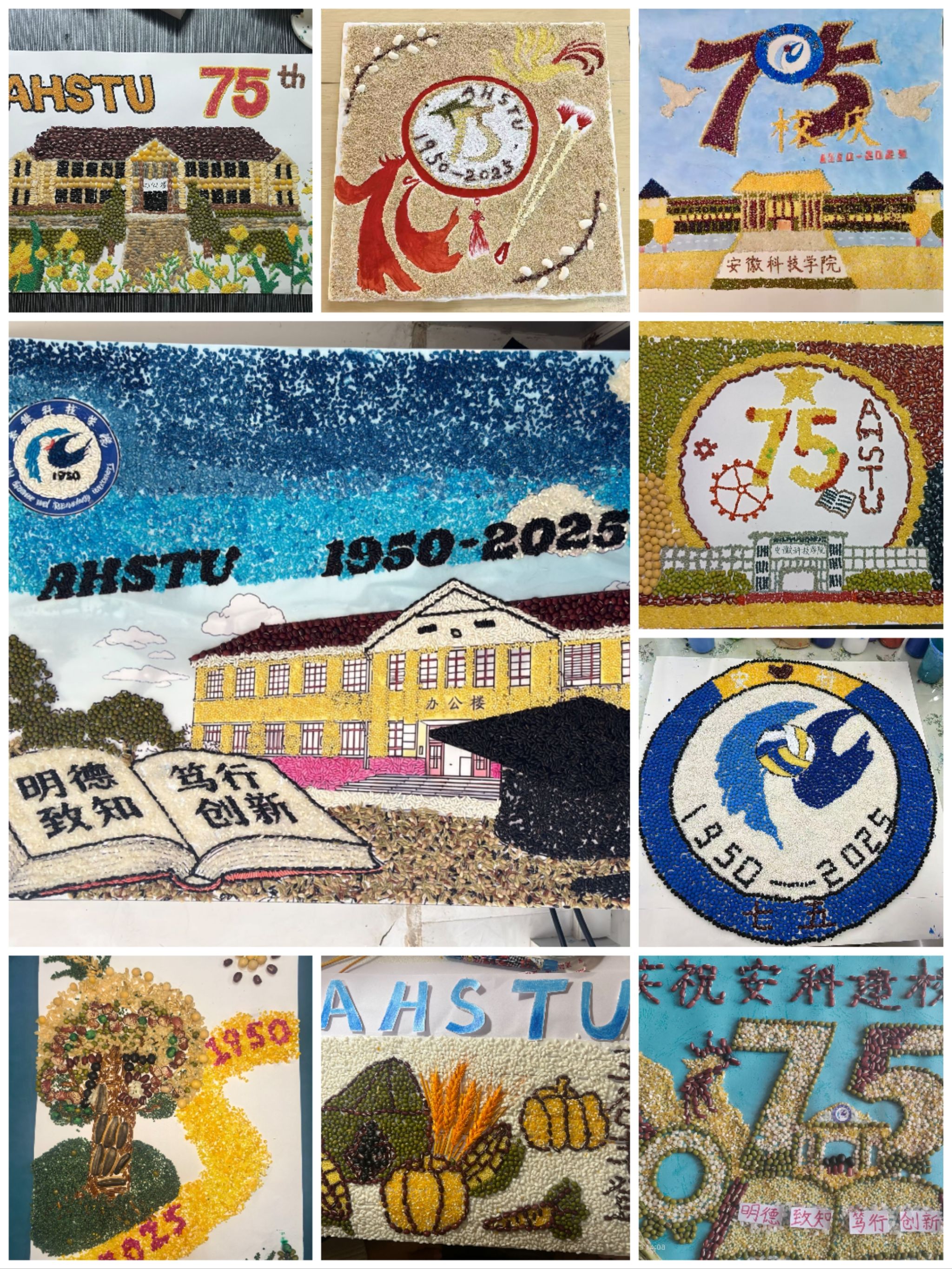 选手们围绕“75周年校庆”主题,以水稻、大米、豆类等十余种作物种子为创作材料,将校徽、校训、图书馆、办公楼等校园地标元素融入作品。20余件作品中,每一粒种子都承载着对学校的祝福,每一幅画作都是艺术创意与校情的生动融合。