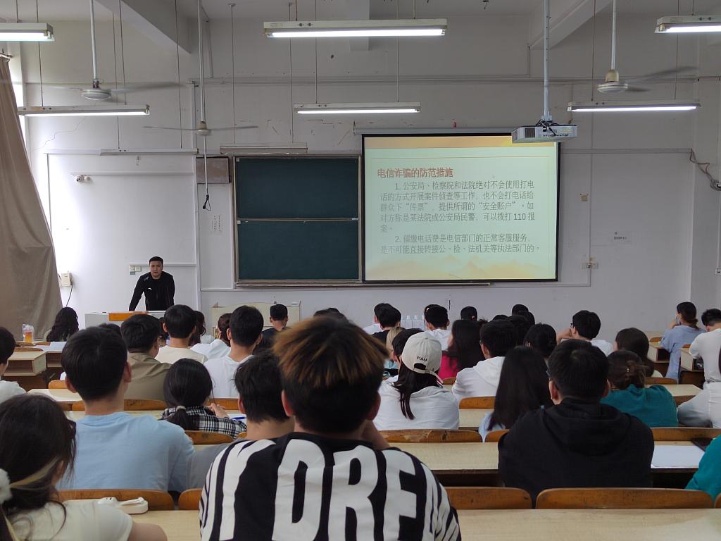 杨孝延首先强调了开展大学生安全教育、培养大学生树立安全防范意识、提高反诈骗意识和能力的必要性和重要意义,告诫同学们“天上不会掉馅饼,遇事三思而后行”。然后就电信诈骗的常见类型,电信诈骗的防范措施两个方面,结合周边高校真实案例,向与会同学详细地阐述如何识别诈骗,如何保护个人财产安全,号召同学们要向亲朋好友广泛宣传反诈骗知识,筑牢反电诈安全防线。