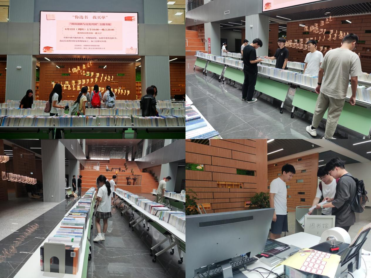 活动前期,图书馆对此次活动进行了精心组织策划。湖北三新文化传媒有限公司向此次书展提供了2100余册科技、创新、文化、教育等类别的高质量图书。书展活动现场,琳琅满目的新书整齐排列,吸引了众多同学的目光。数据分析、人工智能、机器学习等相关图书在书展中广受欢迎。书展现场设置了图书加工点,对同学们选定的图书进行现场加工,仅需要十几分钟,同学们便可以通过自助借还机借到自己心仪的图书。
