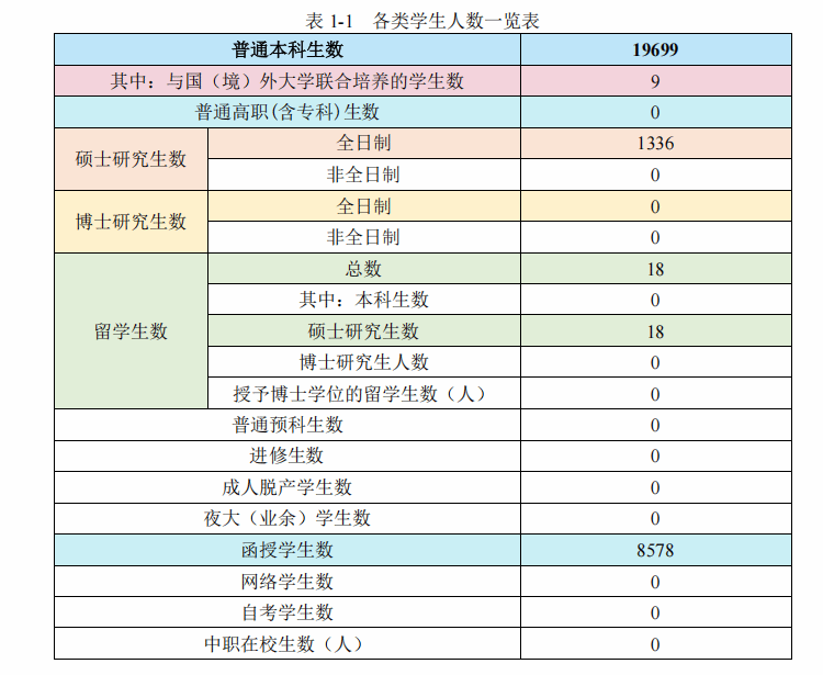 学校有全日制本科生 19699 人,硕士研究生 1336 人,外国留学生(硕士研究生)18 人,本科生数占全日制在校生总数的比例为 93.57%(见表 1-1)