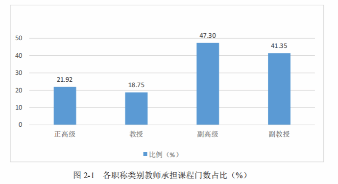 副高级职称教师承担的课程门数为 971,占总课程门数的 47.30%;课程门次数为 2094,占开课总门次的 32.75%。其中副教授职称教师承担的课程门数为 849,占总课程门数的 41.35%;课程门次数为 1905,占开课总门次的 29.80%。见图 2-1。