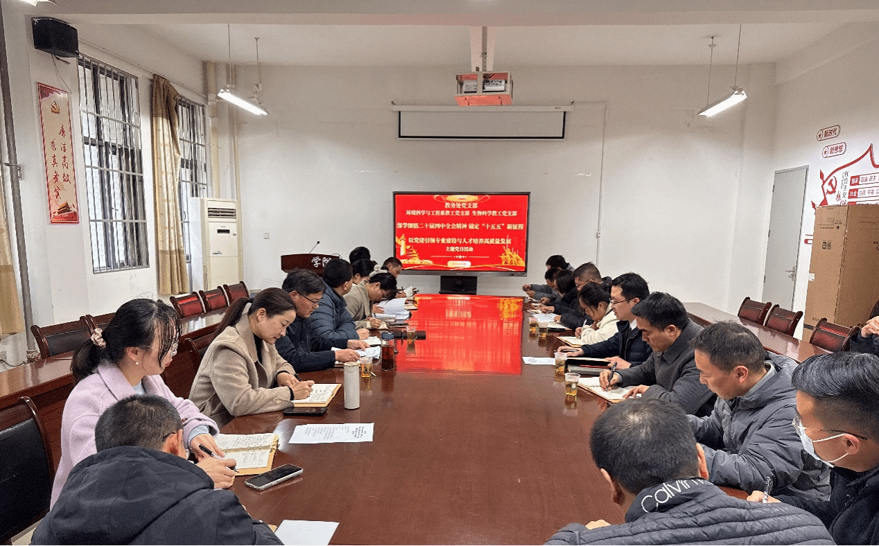 为深入学习贯彻党的二十届四中全会精神,科学谋划学校“十五五”发展蓝图,推动党建工作与教育教学深度融合,2025年11月26日下午,教务处党支部携手环境科学与工程系教工党支部、生物科学系教工党支部,在躬行楼2101会议室联合开展了“深学细悟党的二十届四中全会精神 锚定“十五五”新征程—以党建引领专业建设与人才培养高质量发展”主题党日活动,活动由环境科学与工程系党支部书记纪文超主持。