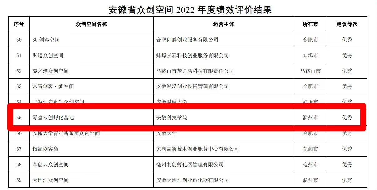 近日,安徽省科学技术厅发布《安徽省科技企业孵化器和众创空间2022年度绩效评价》结果,我校运营的省级众创空间“零壹双创孵化基地”获优秀等次。
