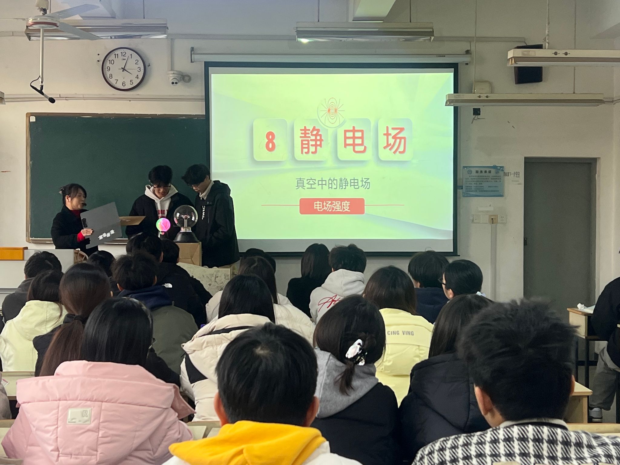 刘念围绕“电场强度”主题,系统讲解了基础概念、计算公式及其物理意义,涵盖点电荷电场、连续分布电荷的叠加原理等核心环节。课堂伊始,她创新性地通过魔法球实验演示静电现象——魔法球在高频电场下放电产生的绚丽光芒直观揭示电场存在;随后,借助会跳舞的小猪模型,生动模拟电场力对物体的影响,将抽象理论转化为可视场景,激发学生兴趣。在理论教学中,刘念结合随堂练习强化学生对库仑定律与电场强度公式的理解,并引导学生探讨电场强度在工程安全中的实际应用。课堂互动频繁,氛围活跃热烈,既有理论深化又有实践启发。
