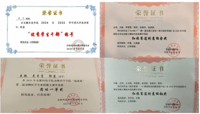 郭苏,女,共青团员,动物医学235班学生,曾获特等奖学金、三好学生、校优秀学生干部,曾获中国国际大学生创新大赛校金奖、中国国际大学生创新大赛校铜奖、动物科学学院“瑞派杯”第二届动物医学专业技能大赛团体一等奖、动物科学学院动物检疫专业技能大赛二等奖。