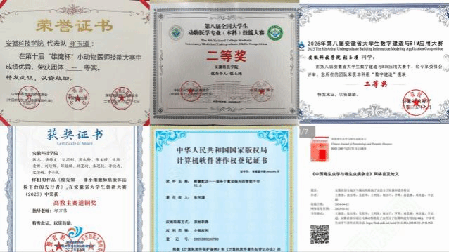 “竞赛和科研不是额外负担,而是让我看清了知识如何应用,形成了学习、实践、再学习的良性循环。”在张玉瑾看来,参与学科竞赛与科研是专业知识落地变现最佳途径,她始终秉持以赛促学、以研践知的理念,在实践中不断突破能力边界。在第十届“雄鹰杯”小动物医师技能大赛上,她凭借扎实的理论功底和熟练的实操技能,斩获大赛团体一等奖。在科研方面,她已发表CSCD论文1篇、拥有软件著作专利1项,还带领团队获安徽省大学生创新大赛铜奖。