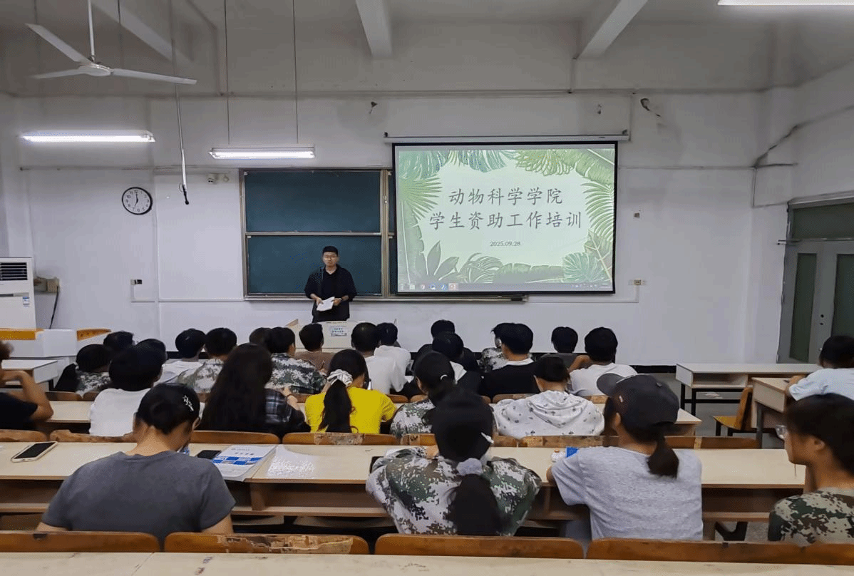 为深入贯彻落实国家及学校学生资助工作部署,进一步织密资助育人网络、提升资助工作精准度与实效性,动物科学学院于9月28日19时在求知楼A101召开学生资助工作培训会。学院2025级本科生班级班长、团支书及生资委员作为班级资助工作的核心骨干参会,会议由学院资助工作联系人周维法老师主持。