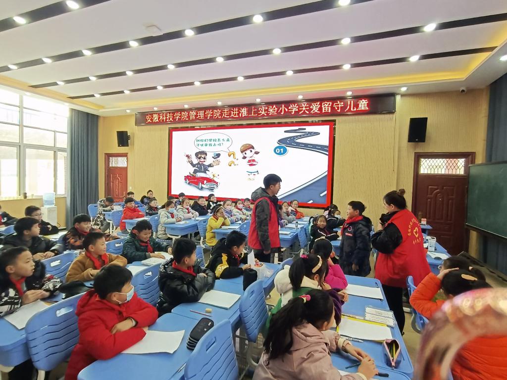 为积极践行志愿服务精神,展现安科研究生良好精神风貌,同时更好关注留守儿童的健康成长,丰富留守儿童的校园文化生活,应蚌埠市淮上实验小学邀请,管理学院根据其需求有针对性地制定了关爱留守儿童“蓝信封”活动实施方案。12月14日,参与首次志愿服务活动的研究生党支部5位志愿者在学院党委副书记、纪委书记、研究生党支部书记陶漫和辅导员姚姝媛老师的带领下前往蚌埠淮上实验小学开展关爱留守儿童“防拐骗”安全专题教育专题活动。活动由农业管理领域2021级研究生刘雅南主讲。