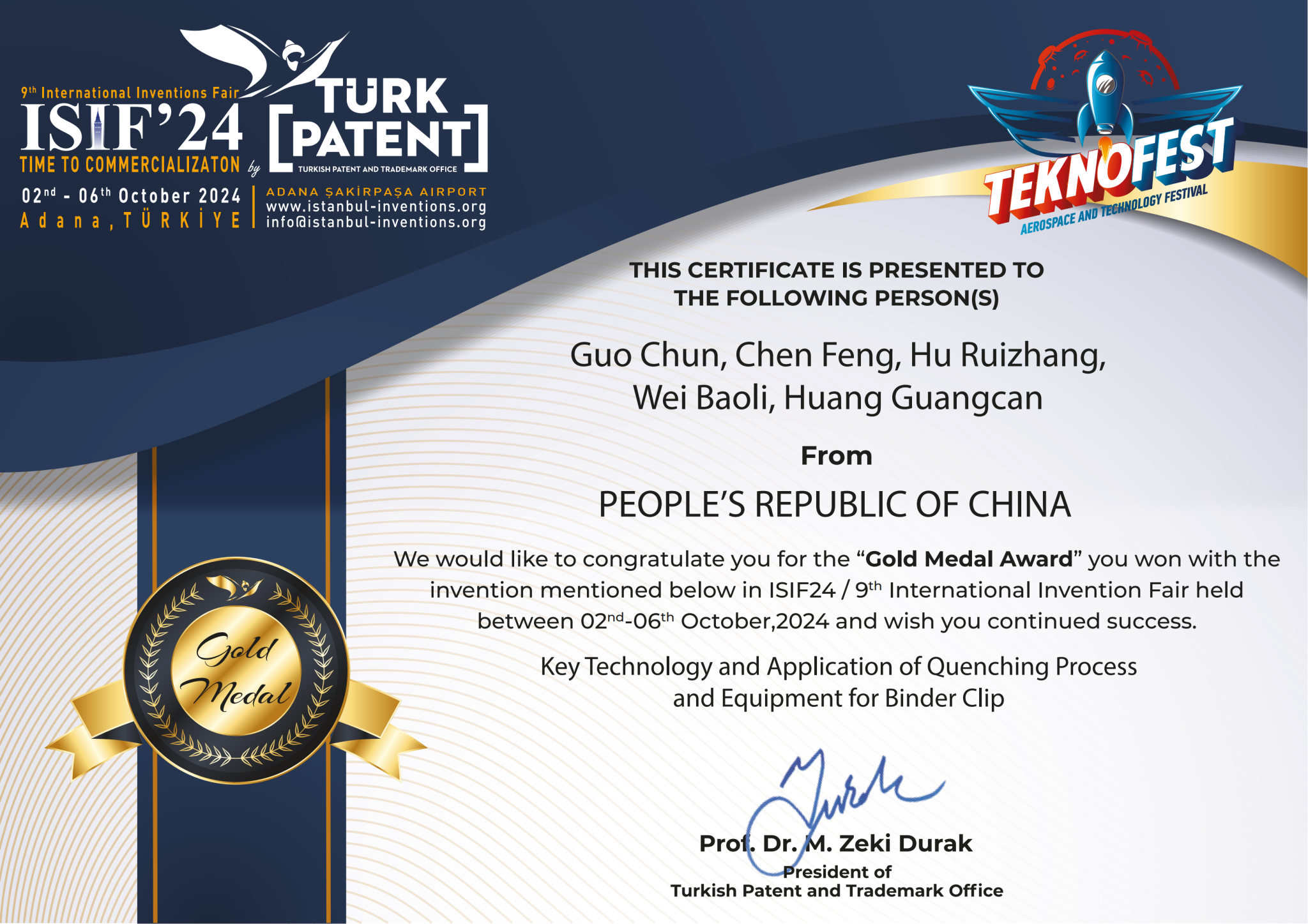 2024年10月02日-10月06日,第九届“伊斯坦布尔国际发明展览会-ISIF’24”在土耳其伊斯坦布尔成功举办。我校机械工程学院材料成型及智能装备科研团队项目《长尾夹淬火工艺与装备关键技术及应用》喜获金奖。