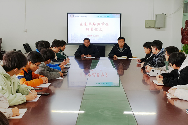 因落实疫情防控工作需要,受上海克来机电自动化工程股份有限公司(以下简称克来机电)委托,12月20日中午,机械工程学院在笃行楼409会议室举行“克来卓越奖学金”颁发仪式,代为颁发“克来卓越奖学金”。仪式由学院党委副书记、纪委书记张程主持,辅导员张立亮和全体“克来班”同学参加会议。